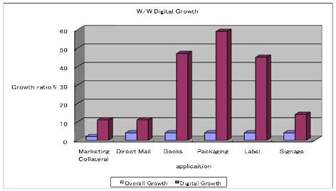 商業(yè)打印領(lǐng)域的焦點(diǎn)在高速寬幅數(shù)碼印刷機(jī),全球只有少數(shù)幾家公司擁有此種技術(shù),市場(chǎng)能見到的主要的機(jī)型有大日本網(wǎng)屏的TruepressJet520,日本宮腰的MJP系列,東京Kikai的Jetreader,惠普的Webpress T300,柯達(dá)的Prosper5000XL等,此類卷紙印刷機(jī)的主要應(yīng)用在直郵、帳單、書報(bào)出版、促銷廣告等方面,以宮腰的MJP20F為例,在1200X1200DPI精度下,速度可達(dá)每分鐘250米,打印幅寬541毫米。