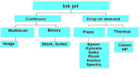 噴墨技術(shù)分為連續(xù)噴墨和按需噴墨(DOD)兩種,前者目前只用在柯達的數(shù)字印刷機上,市場上的絕大部分噴墨打印機都屬于按需噴墨技術(shù),按需噴墨又分為壓電和熱發(fā)泡兩類,熱發(fā)泡噴頭廉價、精度高,但其缺點也是顯而易見的:噴頭壽命短、只適用水性墨水,因之主要用于家庭和辦公室的紙張打?。欢鴫弘妵娔抢锰沾杉由想妷汉髸冃蔚脑?,直接將電壓轉(zhuǎn)換為機械壓力,工作在常溫下,也無需溶解在水中的氧氣幫忙,所以不但噴頭壽命長,而且可以適用各種類型溶劑所生產(chǎn)的墨水。