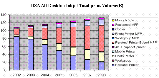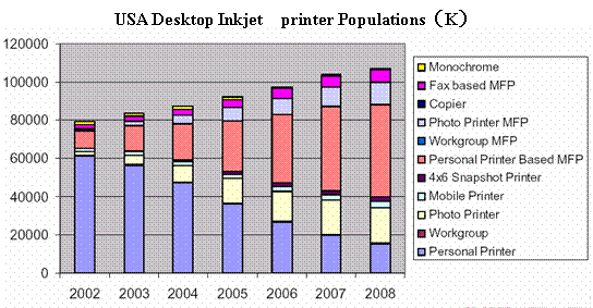 2004年11月15日InfoTrends研究機(jī)構(gòu)發(fā)表的市場調(diào)查結(jié)果表明,2003年美國共安裝了超過8300萬臺桌面噴墨打印設(shè)備,使得噴墨成為桌面打印的主要輸出方式。其中,照片噴墨打印機(jī)裝機(jī)量482萬臺,比02年增加39%。在這里所謂照片打印機(jī)(Photo Printer),是指同時具備照片級彩色輸出性能,數(shù)碼相機(jī)存儲卡插槽,照片級墨盒三種典型特征的打印機(jī)。多功能一體機(jī)(MFP, multifunctional printers or imaging devices)是將打印,掃描,傳真,復(fù)印等功能復(fù)合一體的設(shè)備,其增長的速度也非???,2003年裝機(jī)量1585萬臺,比02年的1085萬臺增長46%。其中部分MFP除打印,掃描,傳真功能外,還具備照片彩色打印功能,這種增長同時也大大提高了特殊打印介質(zhì)(specialty media)的需求。Infotrends預(yù)期到08年,照片噴墨打印機(jī)的年裝機(jī)量可達(dá)1890萬臺,占總裝機(jī)量的18%,普通MFP高達(dá)4800萬臺,占總裝機(jī)量的45%,帶照片彩色打印功能的MFP1160萬臺,占總裝機(jī)量的11%。而普通型個人噴墨打印機(jī)(Personal Pinter)的裝機(jī)量呈逐年下降趨勢,數(shù)據(jù)表明2003年比02年下降了4.3%,普通個人噴墨打印機(jī)所占比例也逐年減少,預(yù)期08年僅占15%以下。2003-2008年間,噴墨打印機(jī)的總裝機(jī)量CAGR 為5%。