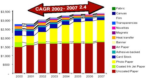 統(tǒng)計數(shù)據(jù)表明,美國家用電腦和打印機(jī)的普及培育了桌面噴墨打印的市場,2004年噴墨方式輸出的1160億張打印紙中,特殊打印介質(zhì)將近300億張,預(yù)期2002年至2007年間普通噴墨打印紙和特殊打印介質(zhì)均會有穩(wěn)定增長,這段時間內(nèi),噴墨打印介質(zhì)的打印數(shù)量年度遞增率(CAGR)為3.5%。2004年美國整個噴墨介質(zhì)的收入超過32億美元,其中普通產(chǎn)品約17億美元,透明片或其它膠片薄膜產(chǎn)品0.5219億美元,特殊打印介質(zhì)超過13億美元。雖然普通產(chǎn)品(commodity)仍是噴墨打印的主要輸出對象,數(shù)量上占了總噸數(shù)的75%,但由于價格低,其銷售額只占總銷售額的40%。 2005年預(yù)期桌面噴墨打印的總量將超過1202億張,市場份額33億美元。2002-2007年間預(yù)期噴墨打印紙的銷售額年遞增率2.4%。特殊打印介質(zhì)包括彩噴紙(Coated paper),照片打印紙(Photo paper),明信片紙,背膠,油畫紙,標(biāo)簽紙等等。在特殊打印介質(zhì)的增長中,彩噴紙的增長速度相比較慢,而照片打印紙增長速度很快,預(yù)計2002-2007年間照片打印紙的年遞增率將高達(dá)16%!這種增長歸功于低價位數(shù)碼相機(jī)的熱銷;低于50美元打印機(jī)的銷售;和數(shù)字圖像傳輸?shù)目旖菪浴?/span>