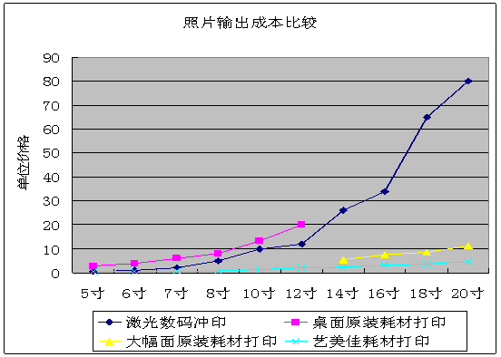 從上圖就可以看出,照片打印機(jī)和基于照片打印的多功能打印機(jī),每年都以30%以上的速度增長,僅美國市場,2005年預(yù)計裝機(jī)量就達(dá)到2000萬臺以上,2008年可達(dá)3000多萬臺。 相比于數(shù)碼激光,照片的噴墨打印輸出至少有如下優(yōu)勢:方便、隨意性強(qiáng):因?yàn)橥耆诩彝ァ⑥k公室實(shí)現(xiàn),可大可小、可多可少,隨時隨地、隨心所欲。私密性好:用不著將數(shù)碼文件交給別人,也用不著從他人處取回,不想讓人見的,別人永遠(yuǎn)見不到。DIY,樂趣無窮:不管是對于專業(yè)人士,還是對于數(shù)碼發(fā)燒友,完全可以陶醉于從拍照、編輯修改到打印輸出的無窮樂趣。環(huán)保:不再用銀鹽等稀缺資源,也擺脫了藥水使用與排放對于環(huán)境的污染。持久不退色:噴墨打印墨水分為染料和顏料兩大類,如果使用顏料墨水打印出的照片,比傳統(tǒng)的銀鹽感光照片能夠保存更長的時間而不退色。 噴墨打印技術(shù)不斷發(fā)展,墨水和打印介質(zhì)品質(zhì)也在不斷提高,從技術(shù)的角度來看,水性顏料墨水+RC間隙型防水高光相紙是照片噴墨的主流方向。不但質(zhì)感、影像品質(zhì)方面毫不遜色于銀鹽感光照片,而且在光線耐牢度、方便性、設(shè)備投入等方面明顯優(yōu)于感光照片。 可能唯一的問題是成本,有的人會抱怨,噴墨打印的成本高,是的,以EPSON照片級噴墨打印機(jī),打印在原裝EPSON高質(zhì)量光澤照片紙上為例,打印一張6寸的照片,成本會在3元以上,而在外面的沖印店里,激光數(shù)碼沖印的報價只有一塊左右。定位于專業(yè)應(yīng)用的大幅面打印機(jī)打?。?4英寸到44英寸寬)成本會低很多,因?yàn)樽烂娲蛴C(jī)墨盒中的墨水,平均每毫升價值10塊人民幣左右,大幅面打印機(jī)墨盒的容量更大,平均每毫升2元上下。從下圖就可以看出,用專業(yè)大幅面打印機(jī)打印照片,成本就已經(jīng)遠(yuǎn)遠(yuǎn)低于激光數(shù)碼沖印的價格,但是這些打印機(jī)并不是給家庭使用的,像激光數(shù)碼沖印一樣,是給專業(yè)的影像服務(wù)機(jī)構(gòu)使用的。