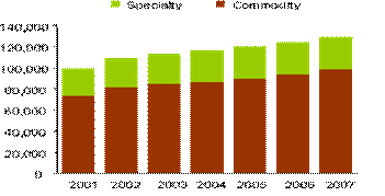 統(tǒng)計數(shù)據(jù)表明,美國家用電腦和打印機的普及培育了桌面噴墨打印的市場,2004年噴墨方式輸出的1160億張打印紙中,特殊打印介質將近300億張,預期2002年至2007年間普通噴墨打印紙和特殊打印介質均會有穩(wěn)定增長,這段時間內(nèi),噴墨打印介質的打印數(shù)量年度遞增率(CAGR)為3.5%。2004年美國整個噴墨介質的收入超過32億美元,其中普通產(chǎn)品約17億美元,透明片或其它膠片薄膜產(chǎn)品0.5219億美元,特殊打印介質超過13億美元。雖然普通產(chǎn)品(commodity)仍是噴墨打印的主要輸出對象,數(shù)量上占了總噸數(shù)的75%,但由于價格低,其銷售額只占總銷售額的40%。 2005年預期桌面噴墨打印的總量將超過1202億張,市場份額33億美元。2002-2007年間預期噴墨打印紙的銷售額年遞增率2.4%。特殊打印介質包括彩噴紙(Coated paper),照片打印紙(Photo paper),明信片紙,背膠,油畫紙,標簽紙等等。在特殊打印介質的增長中,彩噴紙的增長速度相比較慢,而照片打印紙增長速度很快,預計2002-2007年間照片打印紙的年遞增率將高達16%!這種增長歸功于低價位數(shù)碼相機的熱銷;低于50美元打印機的銷售;和數(shù)字圖像傳輸?shù)目旖菪浴?/span>