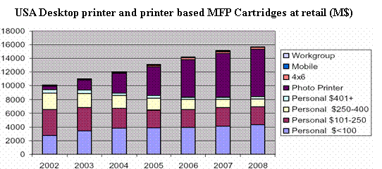 從全美零售市場的數(shù)據(jù)分析, 2003-2008年噴墨墨盒的零售總額年遞增率約8%,其中照片質量墨盒的銷售量呈增長勢頭強勁。由于照片噴墨打印機和具備照片彩色打印的MFP可能使用同一型號墨盒,統(tǒng)計將兩者合并。普通噴墨MFP也和對應的普通個人型打印機合并。數(shù)據(jù)顯示,2003年用于照片打印的墨盒零售總額19.10億美元,占全年零售總額(107.2億美元)的17.8%, 比02年的6.90億美元增加了177%。2008年, 預期用于照片打印的墨盒零售總額可達73.10億美元。對于普通的中高端墨盒零售額,由于受到價格下降和激光打印輸出方式的影響,03年到05年間有明顯下降,05年至08年基本保持不變。而低端的噴墨墨盒一直穩(wěn)中有升。